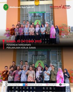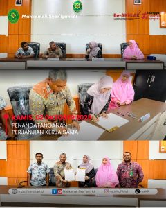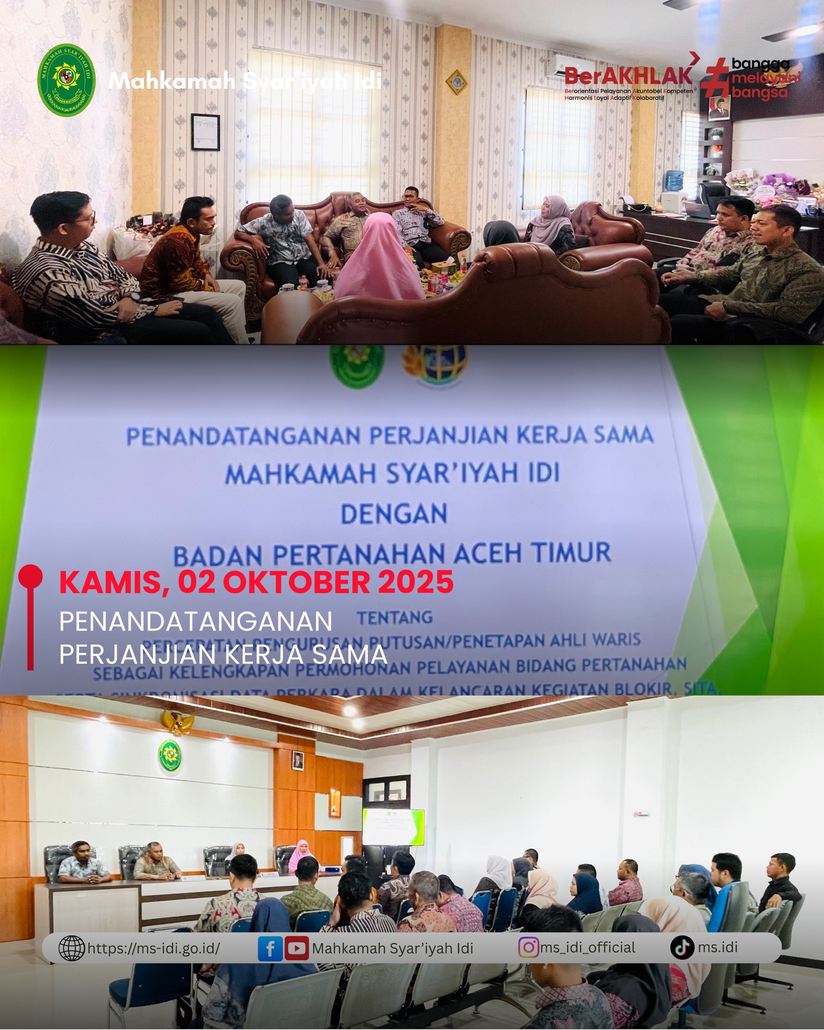 Kamis, 02 Oktober 2025, Bertempat di Aula Mahkamah Syar’iyah Idi, dilaksanakan Penandatanganan Perjanjian Kerja Sama antara Mahkamah Syar’iyah Idi dengan Badan Pertanahan Aceh Timur, yang dihadiri langsung oleh Kepala Kantor Pertanahan, Bapak Zulkhaidir, S.E., M.M., beserta jajarannya. Acara penandatanganan berlangsung khidmat di Ruang Aula Mahkamah Syar’iyah Idi yang juga dihadiri oleh Ketua Mahkamah Syar’iyah Idi, Ibu Wafa’, S.H.I., M.H., beserta jajarannya.