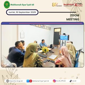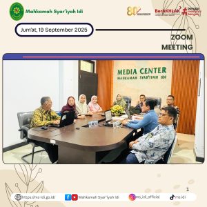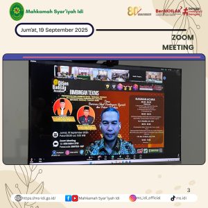 Jum’at, 19 September 2025, Ketua Mahkamah Syar’iyah Idi, Ibu Wafa’,S.H.I.,M.H. beserta jajarannya mengikuti Bimtek Peningkatan Kompetensi Tenaga Teknis di Lingkungan Peradilan Agama secara daring melalui Zoom Meeting dengan Materi : “Dominasi Akad Pembiayaan Syariah dan Potensi Sengketa”, dengan Narasumber: YM. Hakim Agung Kamar Agama Bapak Drs. H. Busra, S.H., M.H. di Ruangan Media Center Mahkamah Syar’iyah Idi.