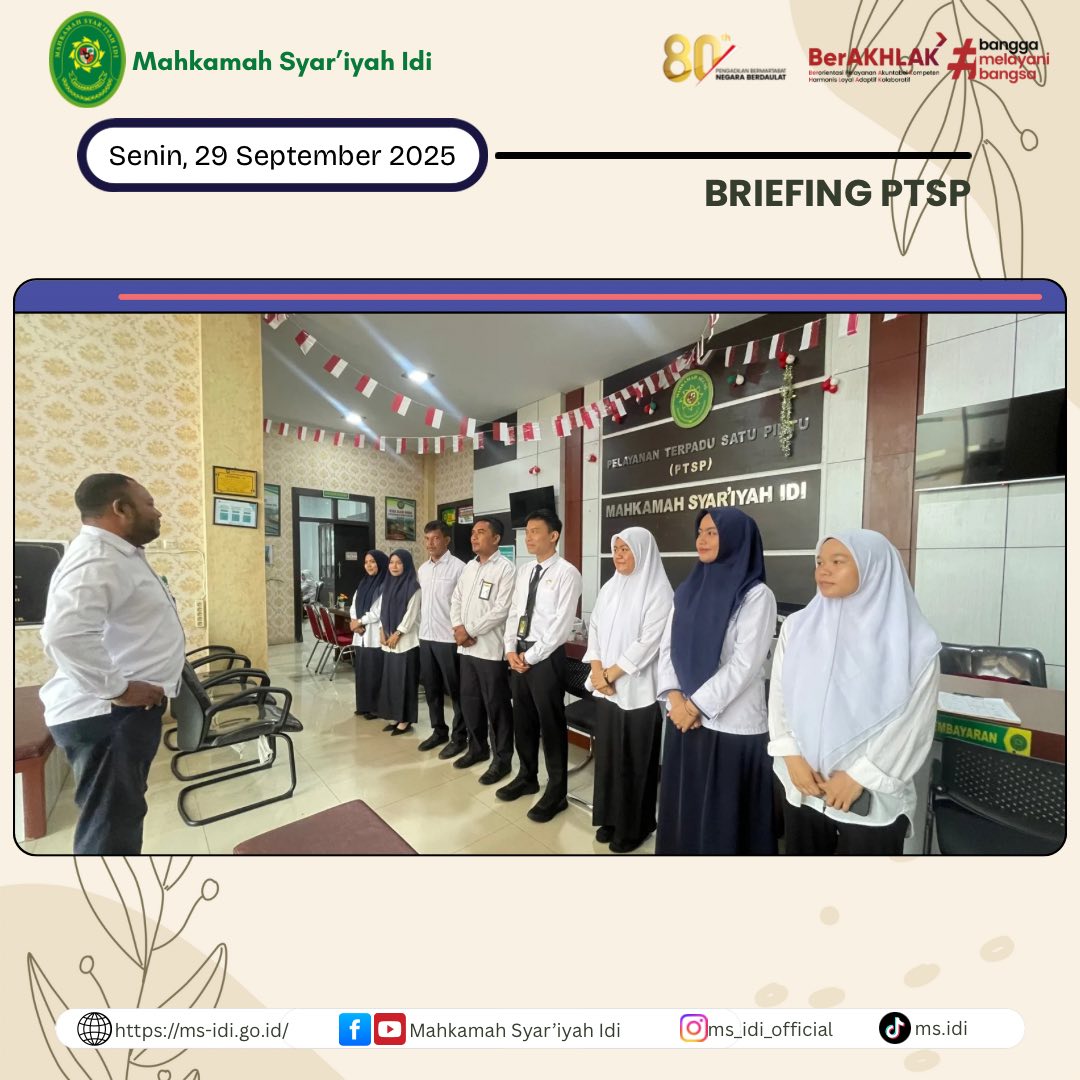 Senin, 29 September 2025 Mahkamah Syar’iyah Idi, melaksanakan Briefing kepada Petugas PTSP (Pelayanan Terpadu Satu Pintu)