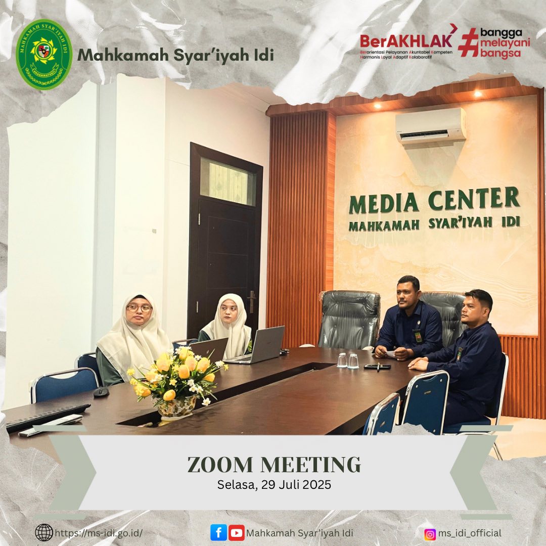 Selasa, 29 Juli 2025 Panitera Mahkamah Syar’iyah Idi, Pak Munawwar, S.H.I., M.H. beserta jajarannya mengikuti “Pelatihan Juru Bicara dan Pengelolaan Media Sosial 4 Lingkungan Peradilan” secara Zoom yang dilaksanakan di Ruang Media Center Mahkamah Syar’iyah Idi.