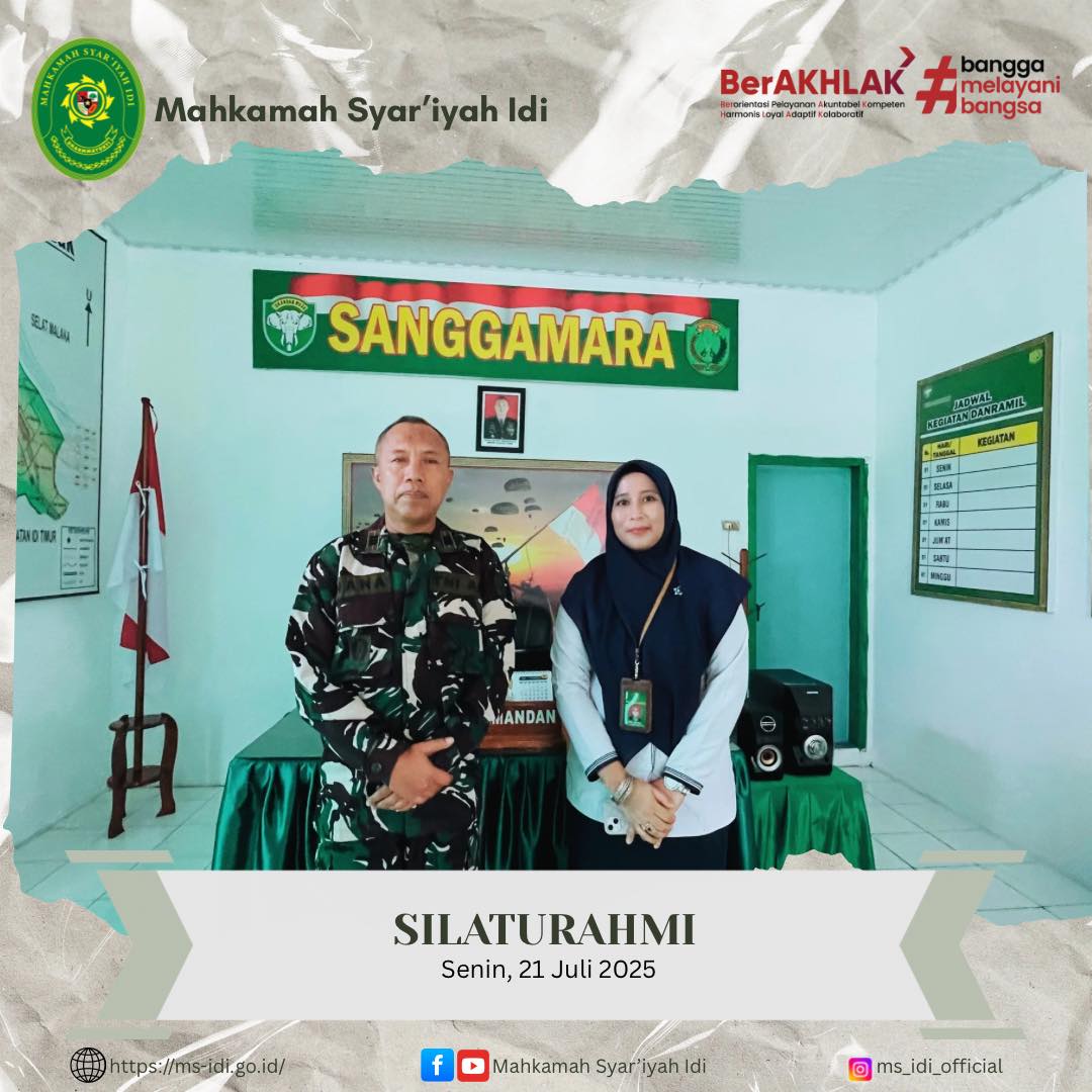 Senin, 21 Juli 2025 Ketua Mahkamah Syar’iyah Idi, Wafa’, S.H.I., M.H. melaksanakan silaturahmi dengan Kapten Arh, Nana Sutiana, Danramil 05/Idi Rayeuk Kabupaten Aceh Timur, dalam rangka membahas rencana kerja sama antara Mahkamah Syar’iyah Idi dalam rangka peningkatan pelayanan kepada masyarakat, khususnya dalam akses keadilan yang lebih baik.