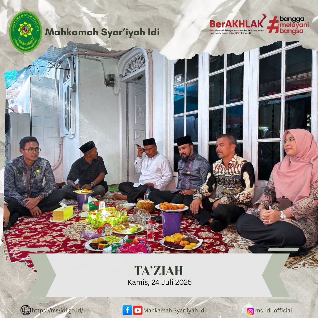 Kamis, 24 Juli 2025 Ketua Mahkamah Syar’iyah Idi, Ibu Wafa’, S.H.I., M.H. beserta Keluarga Besar Mahkamah Syar’iyah Idi Ta’ziah ke Rumah Duka Bupati Aceh Timur di Gampong Blang Bitra, Kecamatan Peureulak atas meninggalnya Ibunda dari Bupati Aceh Timur, Almarhumah Ramlah Binti Basyah.